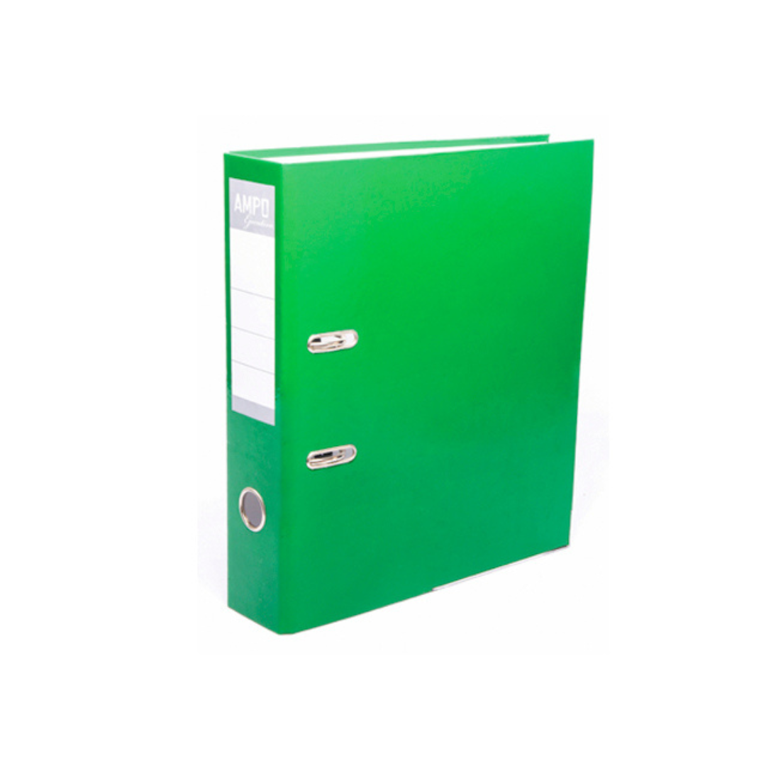 Archivador T-830 Ampo Lux: compuesto de cartón grueso y papel Bond impreso en color verde con dos anillos tipo arco y rados que cierran el archivo y aseguran la integridad física de sus documentos, tamaño carta.
