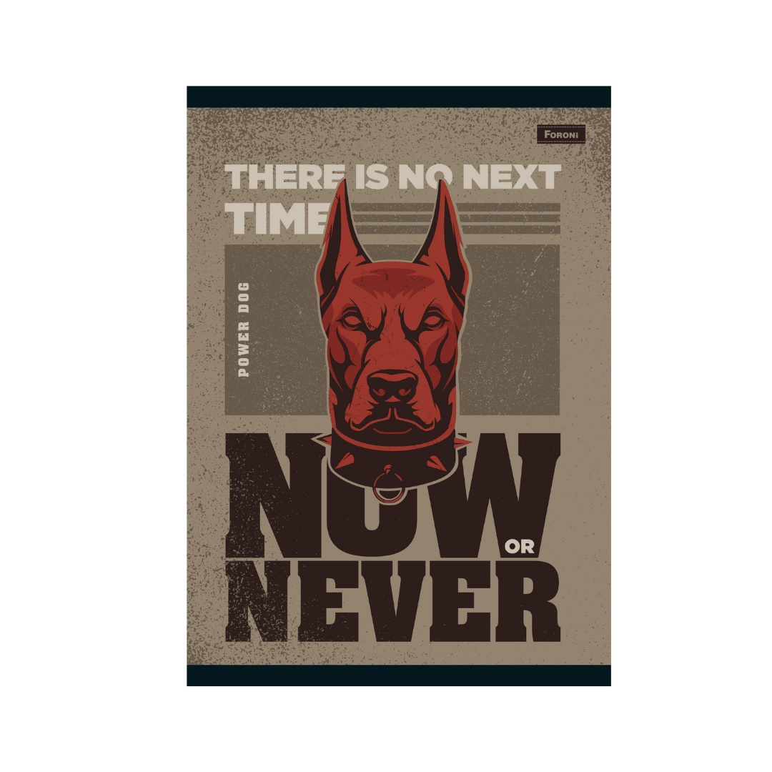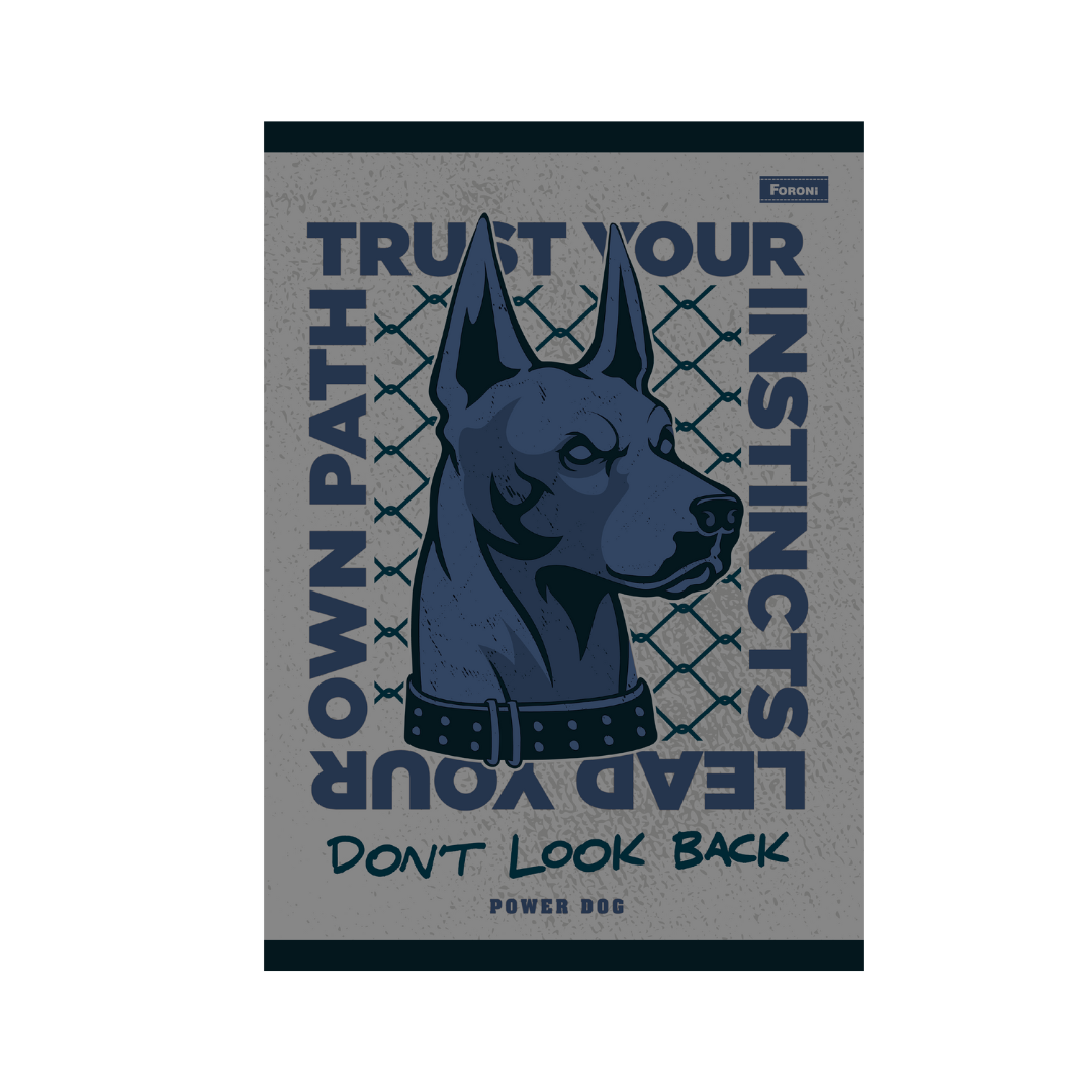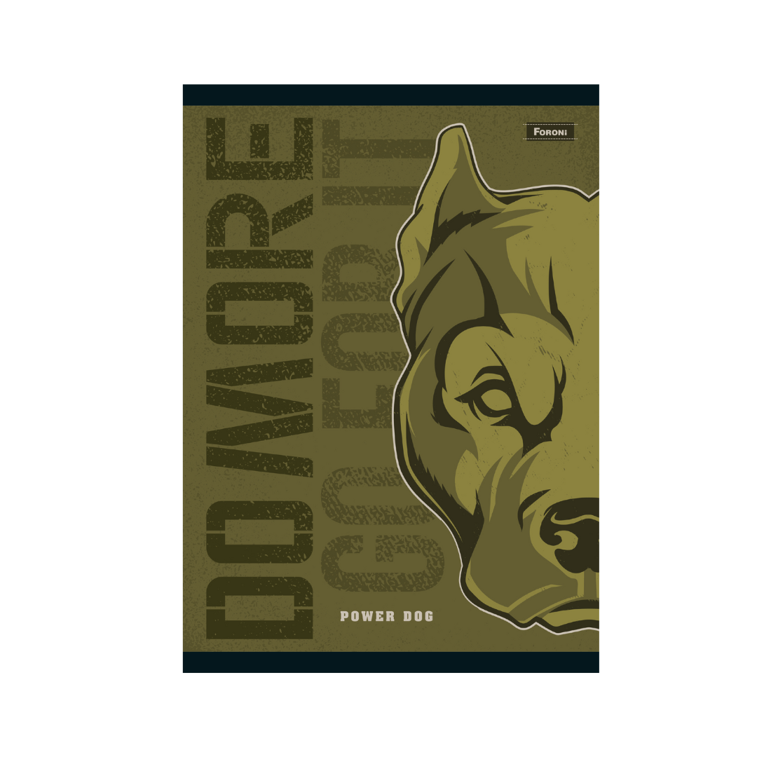 El Cuaderno Power Dog presenta un aspecto imponente, tonos sobrios y un personaje con mucha actitud combinado con frases llenas de determinación.