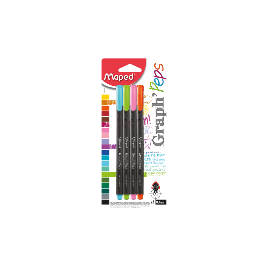 El gráfico de punta fina Peps Fancy X4 de Maped es la elección perfecta para dar color y estilo a tus notas y cuadernos con precisión excepcional. Cada rotulador está equipado con una punta de 0,4 mm, diseñada con metal de alta calidad que asegura trazos precisos y definidos.