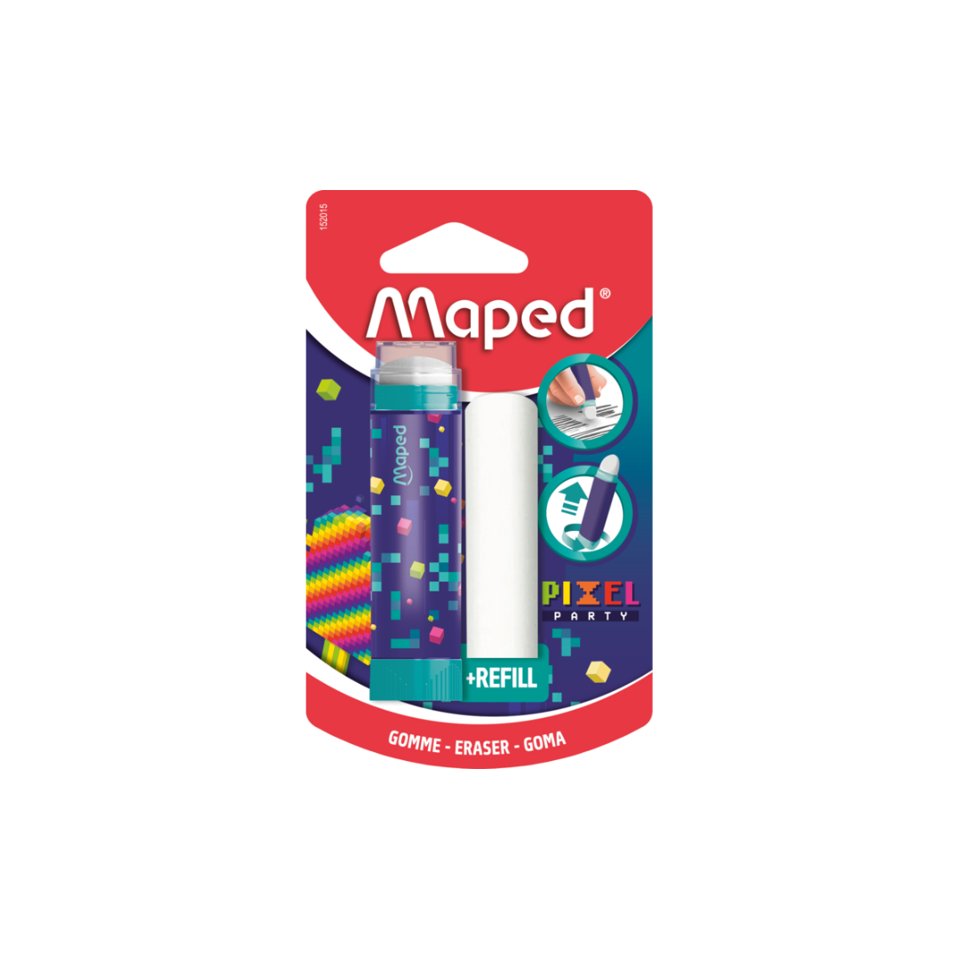 ¡La borra en forma de tubo Pixel Party es la nueva borra práctica y moderna de Maped! Su decoración hará que sea un producto que encantará a los niños.