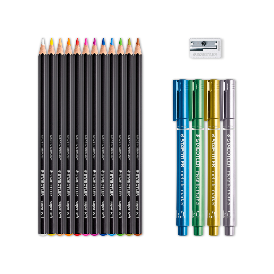 Caja de cartón que contiene 12 lápices de colores súper suaves y 4 rotuladores metálicos ambos de colores surtidos y 1 sacapuntas metálico.